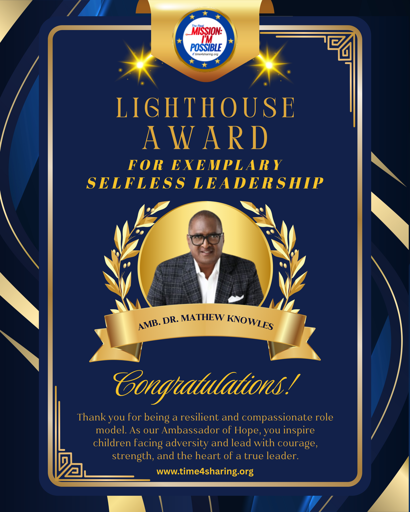 ORLANDO, FL, UNITED STATES, February 13, 2026 /EINPresswire.com/ -- Time 4 Sharing Mission I’M Possible Corp. (time4sharing.org), a global children’s charity, announced that Ambassador Dr. Mathew Knowles, cancer survivor, outspoken advocate for early cancer testing, and father of recording artist Beyoncé Knowles-Carter, has received the organization’s Humanitarian Leadership Lighthouse Award for exemplary, selfless leadership.